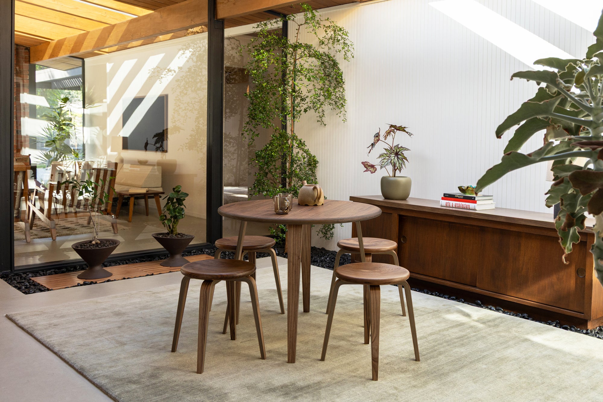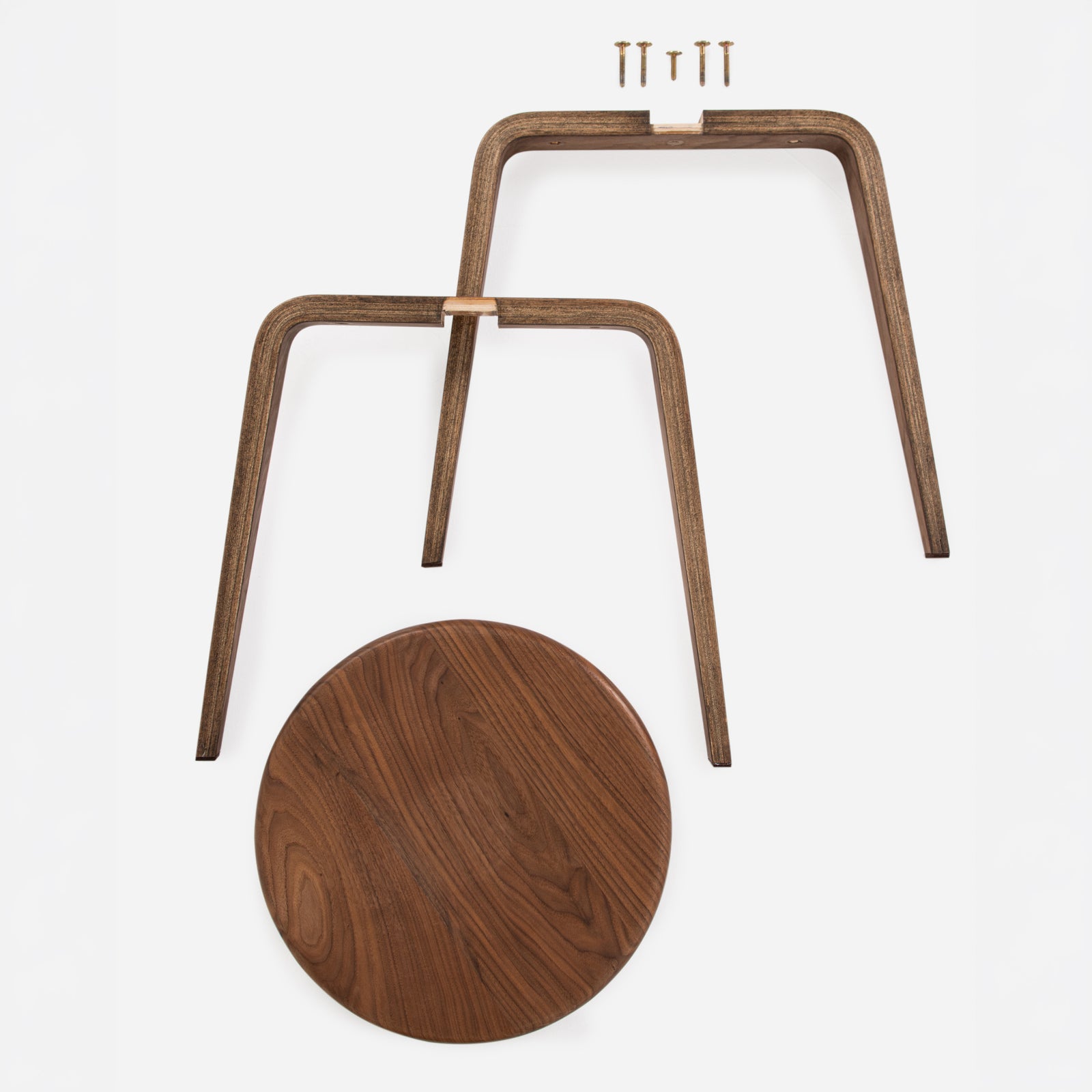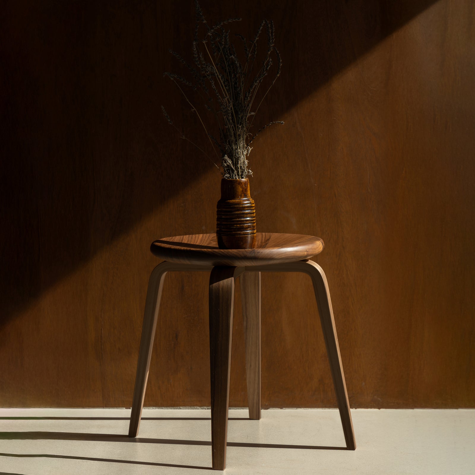 The stool’s three-part construction pairs a carved solid wood seat with two intersecting spars of 16-layer North American maple plywood, making it equally suited as a seat or side table.